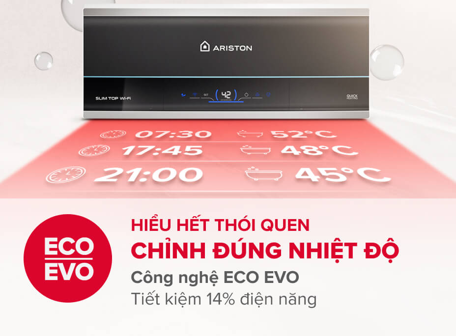 - Công nghệ ECO EVO đề xuất nhiệt độ đun theo nhu cầu, tiết kiệm 14% điện năng.
